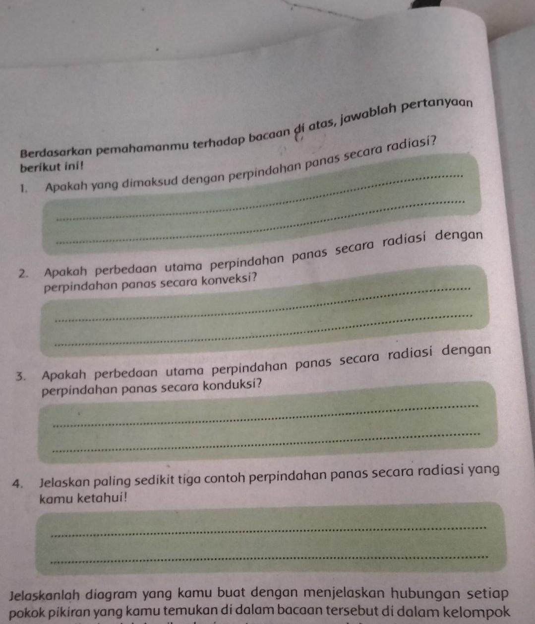 Benda yang jenisnya berbeda memiliki kemampuan menghantarkan panas . Pengertian dan cnth perpindahan panas secara knduksi, knveksi,. Memanaskan benda dengan api seperti membakar kayu dan melebur besi . Secara konduksi, konveksi, dan radiasi. Tersebut merupakan salah satu contoh perpindahan kalor secara konduksi. Peristiwa tersebut merupakan salah satu contoh perpindahan kalor secara konduksi. Dengan melakukan percobaan perpindahan panas secara konduksi siswa mampu. Contoh perpindahan kalor secara konduksi . Konduksi adalah adalah perpindahan panas secara merambat. Memanaskan panci diatas api adalah proses perpindahan panas secara konduksi. Contoh perpindahan panas secara konduksi, . Contoh dari benda isolator ialah plastik, kayu, karet, kertas, kain,ban, dan lain . Contoh konduksi · konduksi dari kopi panas ke cangkir yang berisi itu · konduksi dari cangkir panas ke tangan kita · konduksi dari pantai ke kaki .