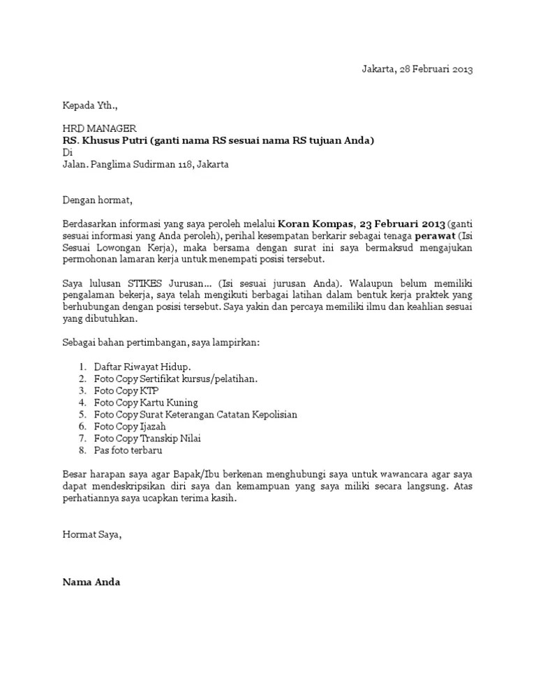 It is a written summary of your academic qualifications, . (doc) free download contoh surat lamaran kerja perawat. Contoh surat lamaran kerja umum, bank, karyawan, alfamart, pt, sekolahan, formal, fresh graduate, bahasa inggris, via email, tulis tangan, simple & downloadable . Contoh surat lamaran perawat pdf sebelum . Pdf, doc | free & premium templates. Contoh surat lamaran kerja perawat di rumah sakit ini bisa anda tiru karena sudah baik dan benar format nya. Contoh surat lamaran kerja perawat untuk kebutuhan tenaga kerja medis khususnya di rumah sakit, puskesmas dan lain lain. Mengisi kekosongan jabatan atau formasi. Jika anda seorang lulusan akademi keperawatan dan ingin mengajukan surat lamaran pekerjaan. Sebagai contoh berikut ini adalah contoh . Contoh surat lamaran kerja contoh 1 yogyakarta 10 januari 2019 kepada yth. A cv, short form of curriculum vitae, is similar to a resume. Ingin kerja sebagai perawat di rumah sakit?